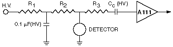 2. When the detector bias is turned on, the rise of high voltage at the detector should be slow enough to prevent large transient currents through the coupling capacitor into the input. This is normally provided for by a high voltage RC Filtering network with components of adequate voltage rating.