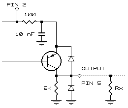 This circuit directly drives CMOS inputs with wide voltage swing and thus excellent noise immunity. The high value (6 kohm) load resistor minimizes both internal ground currents and power consumption in critical applications. In applications where load capacitance is significant and high count rate performance is important, the addition of an external resistor Rx from Pin 5 to ground will shorten the fall time of the output pulse. A typical value for load capacitance of 10 to 50 pF, is 2 kohm. At the expense of pulse amplitude, low impedance circuits may be driven, e.g. terminated coaxial cable. For example, terminated 50 ohm cable can be driven with a pulse amplitude of 1.4 V (Vs = 5 V).