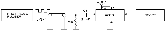 The A203 can be tested with a pulser by using a small capacitor to inject a negative test charge into the input. The unit will respond to the negative-going edge of either a square wave or a tail pulse with long fall time (> 10 µs). In either case the negative-going transition should be less than 20 ns. Charge transfer in the circuit is according to Q = C·V, where Q = total amount of charge delivered to input, C = test capacitor and V = amplitude of the pulse. Use only a small capacitor in this circuit (1 to 10 pF). DO NOT connect a low impedance pulser through a large capacitor when testing as this will overdrive the input and may damage the unit. Example: A 22 mV tail pulse across a 2 pF test capacitor is equivalent to 1 MeV energy loss in silicon (3.5 eV/pair) and will produce a 210 mV unipolar pulse at Pin 8.