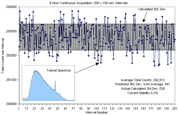 For long term stability investigations, Figure 7 shows the plot of the output X-rays (total counts file) over 6 hours. The inset in the plot is a graph of one of the spectra saved. Between the total counts file and the full spectrum at each point, a total analysis can be made of the x-ray tube stability and integrity. The plot also shows the Average, Predicted Standard Deviation, Calculated Standard Deviation, and Current Stability. The total counts file enables these four calculations to be made easily in any spreadsheet program.