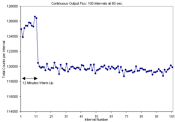For short term stability investigations, Figure 5 shows the setup of the DPPMCA software. It is set up for a routine of 100 repeated spectra of 60 seconds each. The plot of the output X-rays (total counts file), as seen in Figure 6, shows that the X-ray tube and controller take about 12 minutes to warm-up before they stabilize.