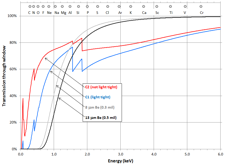 C2 Windows: Vacuum applications. The C2 window has much better efficiency at the lowest energies but is not light-tight and therefore must be used in dark environments.