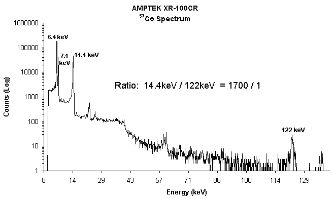 The XR-100CR 7 mm2/300 µm detector is an excellent detector for Mössbauer Spectroscopy. Since the thickness of the detector is only 300 µm, it is very efficient at 14.4 keV and very inefficient at 122 keV. The 57Co spectrum shown here shows a detection efficiency ratio between 14.4 keV and 122 keV of about 1700/1. By using a thin Aluminum absorber between the detector and the source, the 6.4 keV and 7.1 keV peaks can also be eliminated, leaving the 14.4 keV as the only detectable energy peak.
