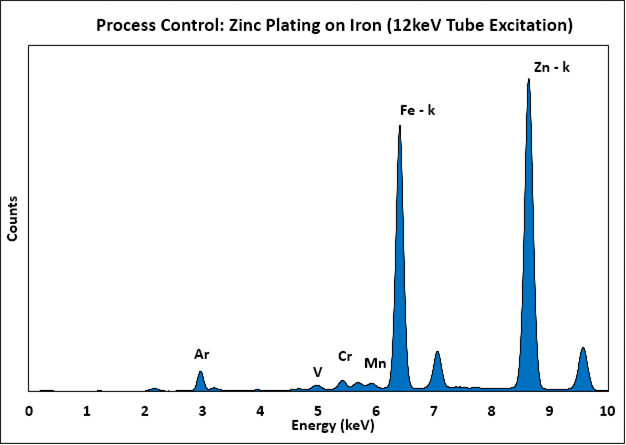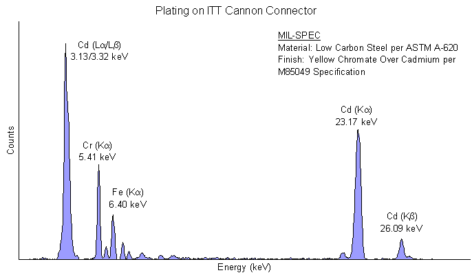The spectrum below show the plating on electronic connectors. Since Cd cannot be used in certain connector applications, it can be important to verify its presence or absence. This spectrum clearly demonstrate that Cd and Cr were both used in the plating on the steel connector.