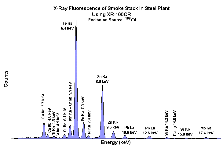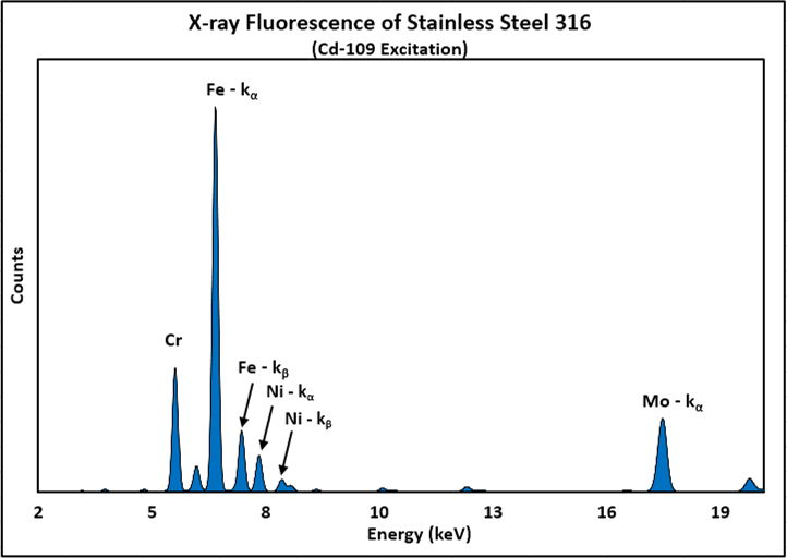 XRF can be used to determine exactly the alloy of a particular piece of metal. Each alloy has a unique ratio of elements, and with XRF, one can non-destructively determine the ratio of elements from the ratio of the intensities of the peaks. The spectrum below shows the spectrum of X-rays emitted from a piece of stainless steel 316, when excited by 109Cd. The strong Fe line indicates that this is based on iron, while the Cr, Mn, Ni, and Mo peaks can be used to identify the alloy. This can be very important in numerous applications, such as quality assurance (verifying a vendor used the correct alloy), process control, metal recycling, etc.