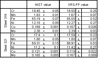 Table 1. Results obtained using XRS-FP2 on two stainless steel alloys. These were “standard reference materials” from NIST. The data were taken using Amptek’s XR-100-SDD detector with the PX5 signal processor, Mini-X X-ray tube, and MP1 mounting plate.