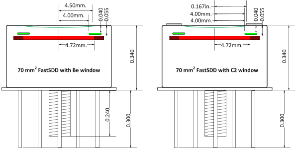 Amptek has developed a 70 mm² FAST SDD® Detector in a TO-8 package. This is the same package that is used with all Amptek detectors. This makes the 70 mm² a drop in replacement (same package, same pin-out, same voltages). Triple the count rate vs. the 25 mm² SDD with the same performance.