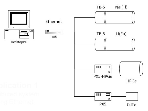The TB-5 uses the same communications protocols and interface software as Amptek’s other digital pulse processors. This includes the PX5-HPGe (for use with high purity germanium detectors in high resolution gamma-ray spectroscopy), the GammaRad-5 (for ruggedized scintillation applications), the PX5 (a general purpose processor which can be used with CdTe or coplanar grid semiconductors), and the DP5 (a board designed for embedded applications). A single computer can easily interface to a network of dissimilar radiation detectors. The drawing below illustrates just a few concepts for interconnecting radiation detectors using Amptek’s digital processing technology.
