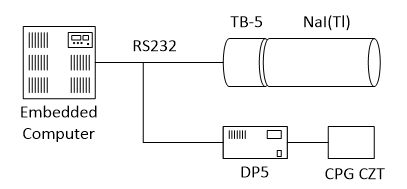 The RS232 interface is well suited to embedded systems, avoiding the overhead of USB and Ethernet. In a handheld radioisotope identifier, the RS232 interface to the TB-5 is straightforward to implement. One can even use multiple sensors, e.g. combining a DP5 processor to read out a semiconductor detector with the TB-5 mated to a scintillator. In addition, one can use commercially available RS232 adapter modules for other communication protocols: RS232 to Bluetooth, RS232 to WiFi, and others are available.