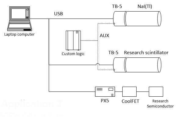The USB interface is ideal for smaller networks, with the 3 meter (max) cable. This works very well in research or operational laboratories. A single laptop can interface with multiple radiation detectors, for example high purity germanium detectors in a counting lab combined with gamma-ray and neutron scintillators used for radiation safety. The auxiliary connectors on all of the processors permit easy integration with external electronics, e.g. using gate signals to do coincidence measurements, to do beam—on versus beam-off measurements, and so on.