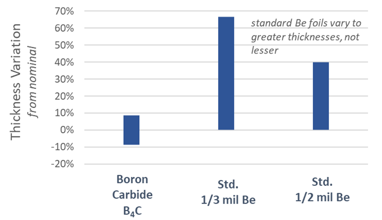In comparison to beryllium (Be) window thickness, B4C window thickness is far more consistent due to the highly controllable semiconductor fabrication methods. The result is that B4C can provide more predictable transmission behavior, particularly at low energies.