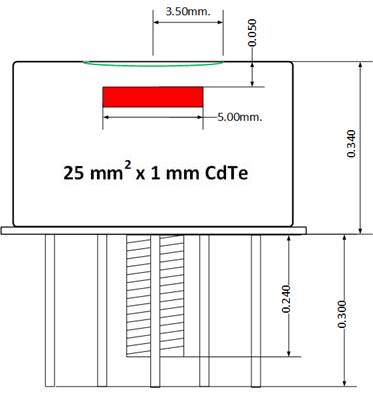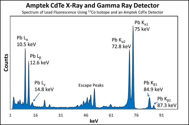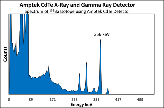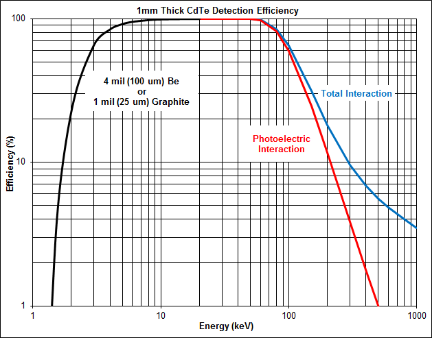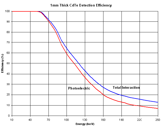 X-rays & gamma rays interact with CdTe atoms to create an average of one electron/hole pair for every 4.43 eV of energy lost in the CdTe. Depending on the energy of the incoming radiation, this energy loss is dominated by either the photoelectric effect or Compton scattering. The probability or efficiency of the detector to “stop” the incoming radiation and create electron/hole pairs increases with the thickness of CdTe.